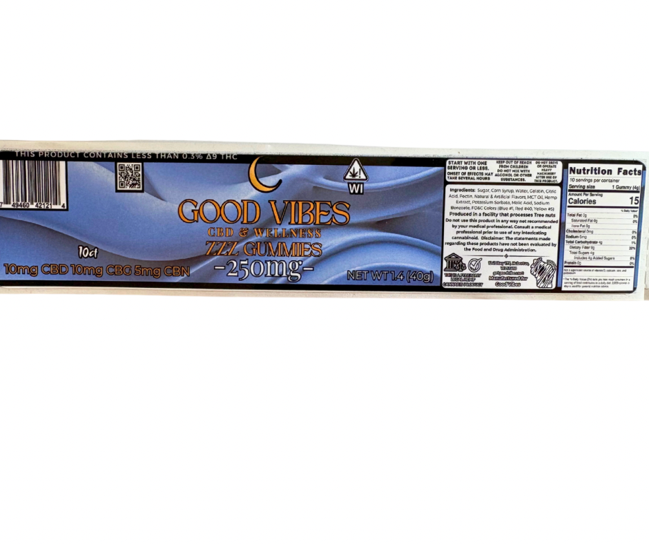 Ingredients: sugar, corn syrup, water, gelatin, citric acid, pectin, natural & artificial flavors, MCT oil, hemp extract, potassium sorbate, malic acid, sodium benzoate, FD&C Colors (Blue #1, Red #40, Yellow #5)