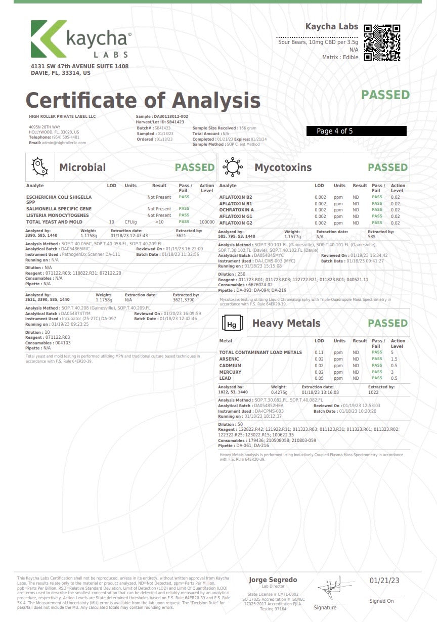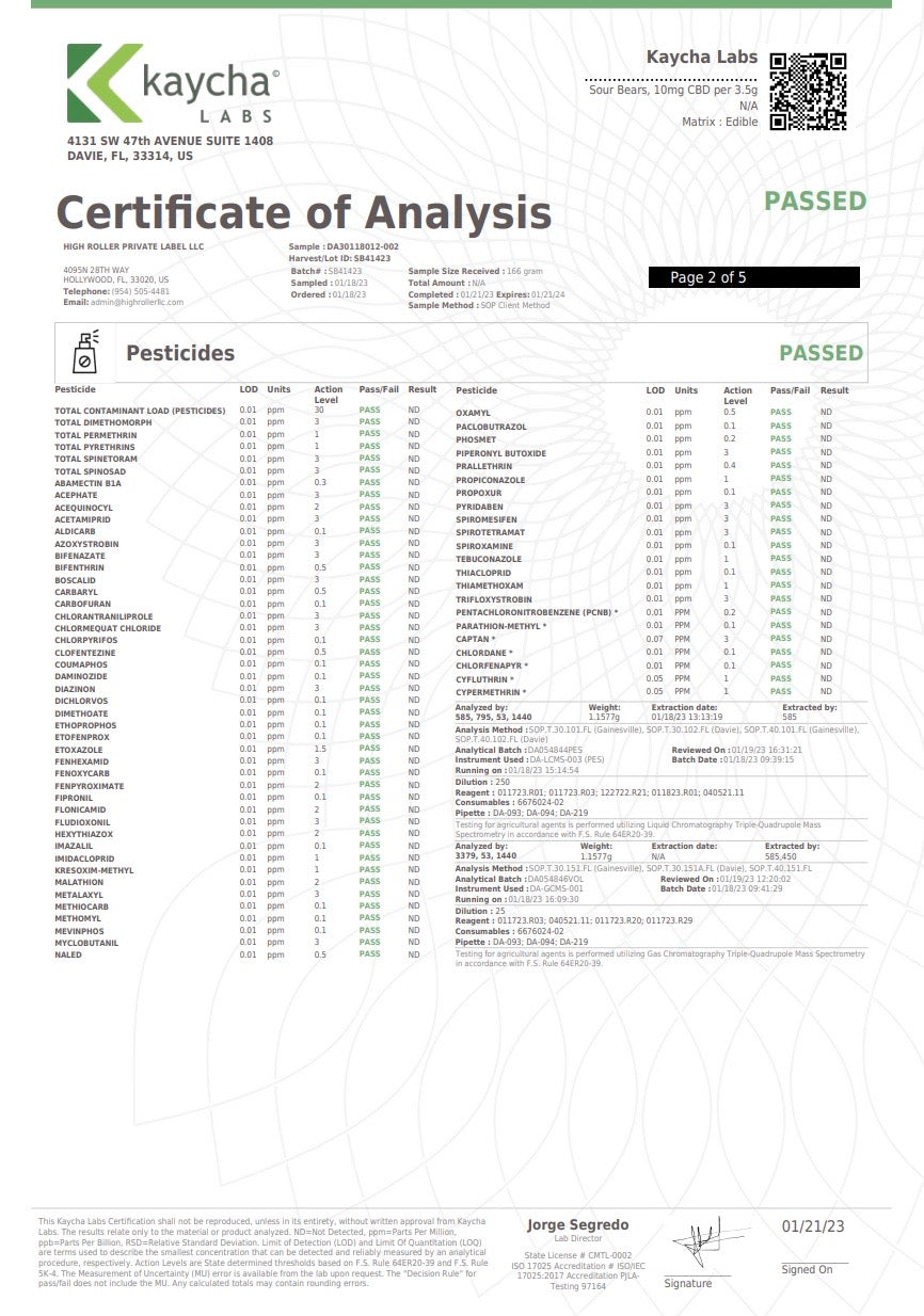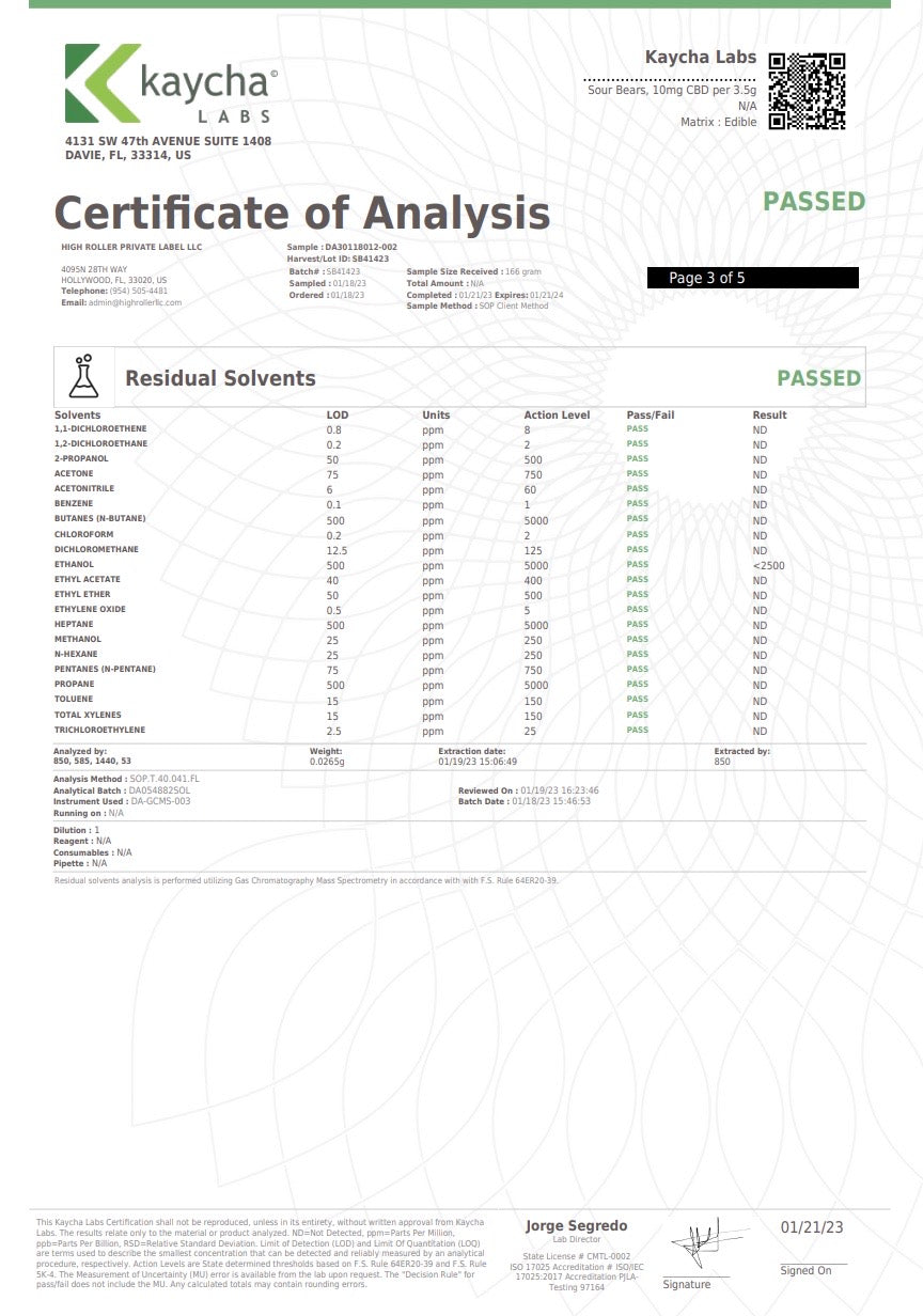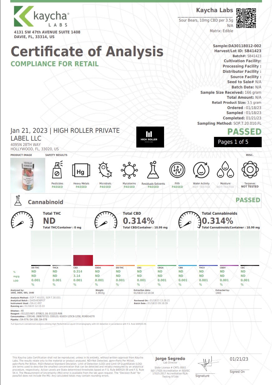 CORN SYRUP (FROM CORN), SUGAR (FROM BEETS), WATER, GELATIN, LACTIC ACID, CITRIC ACID, NATURAL AND ARTIFICIAL FLAVORS, PECTIN (DERIVED FROM FRUIT), FD&C YELLOW #5, FD&C RED #40, FD&C YELLOW #6, FD&C BLUE #1, HEMP EXTRACT CANNABIDIOL (CBD), Coconut oil.