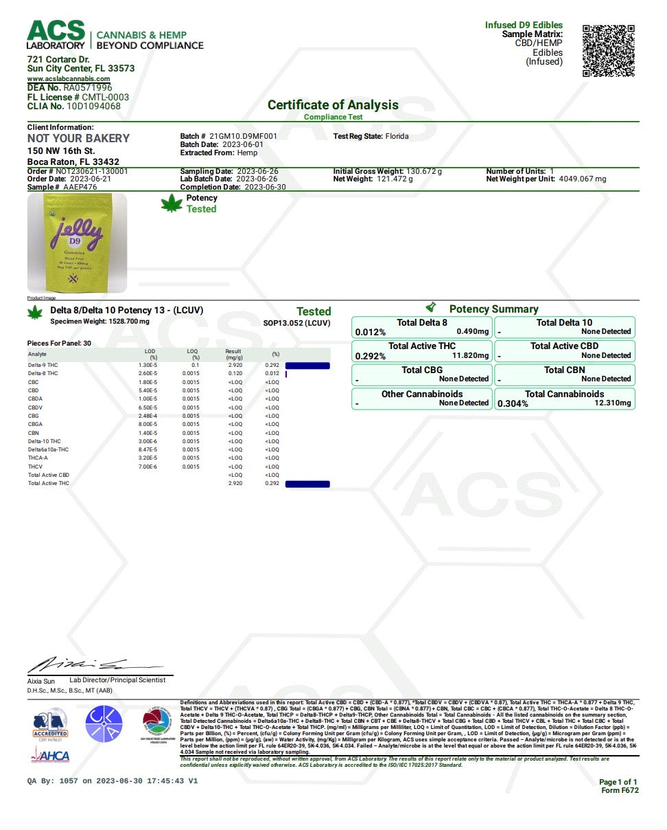 Ingredients: Cane Sugar, Light Corn Syrup, Pectin, Citric Acid, Natural & Artificial Flavors, FD&C Red 40, FD&C Blue 1, Hemp Extract, MCT Oil